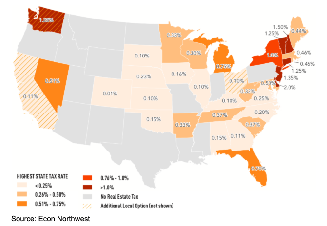 For example, the bill could dictate that a 1% tax would only apply to the value of homes sold for over $1.5 million. If a home sold for $1.6 million, $100,000 (the amount over $1.5 million) would be the taxable amount to levy $1,000 in real estate taxes (1% of $100,000). See the current RET rates across the country below.